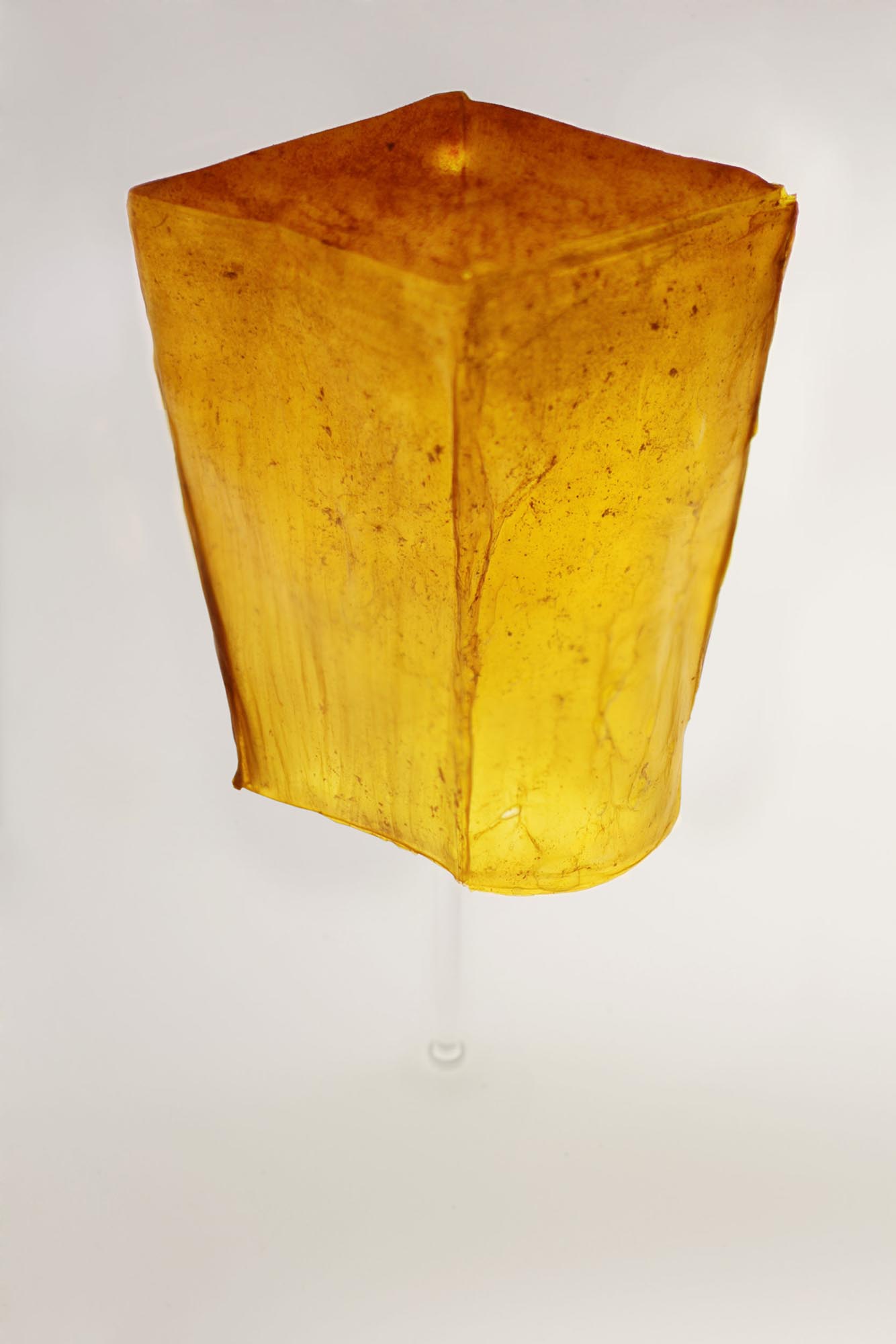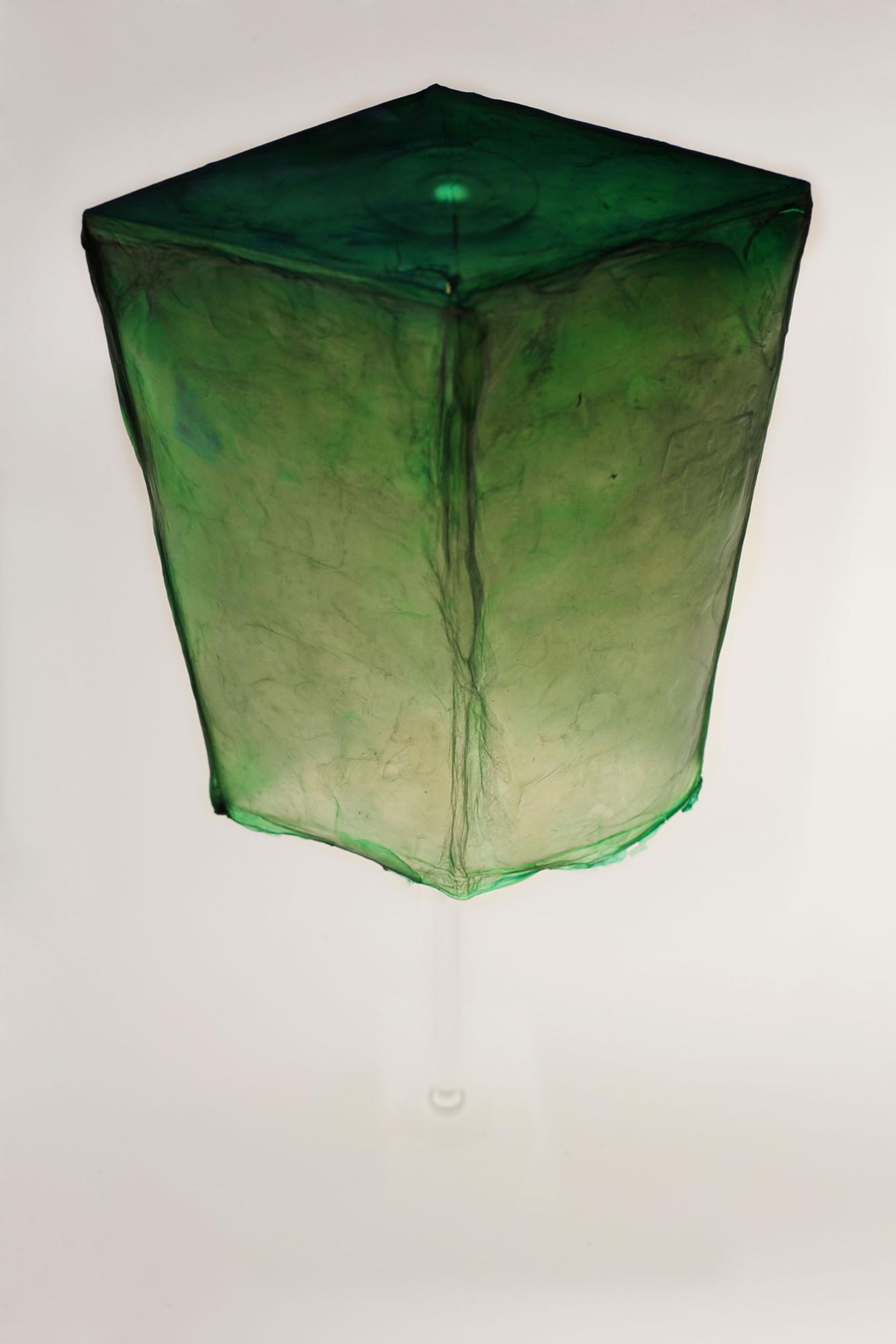 In Programming Cones, we explored the capabilities to not only shape a bacterial co-created material, but also its properties, like flexibility, stiffness, texture and colour.We used the term of programming for this subsequent process. The new material provides the potential to serve as an alternative to fossil plastics and composite materials being tangible as a prototype in the shape of a cone.